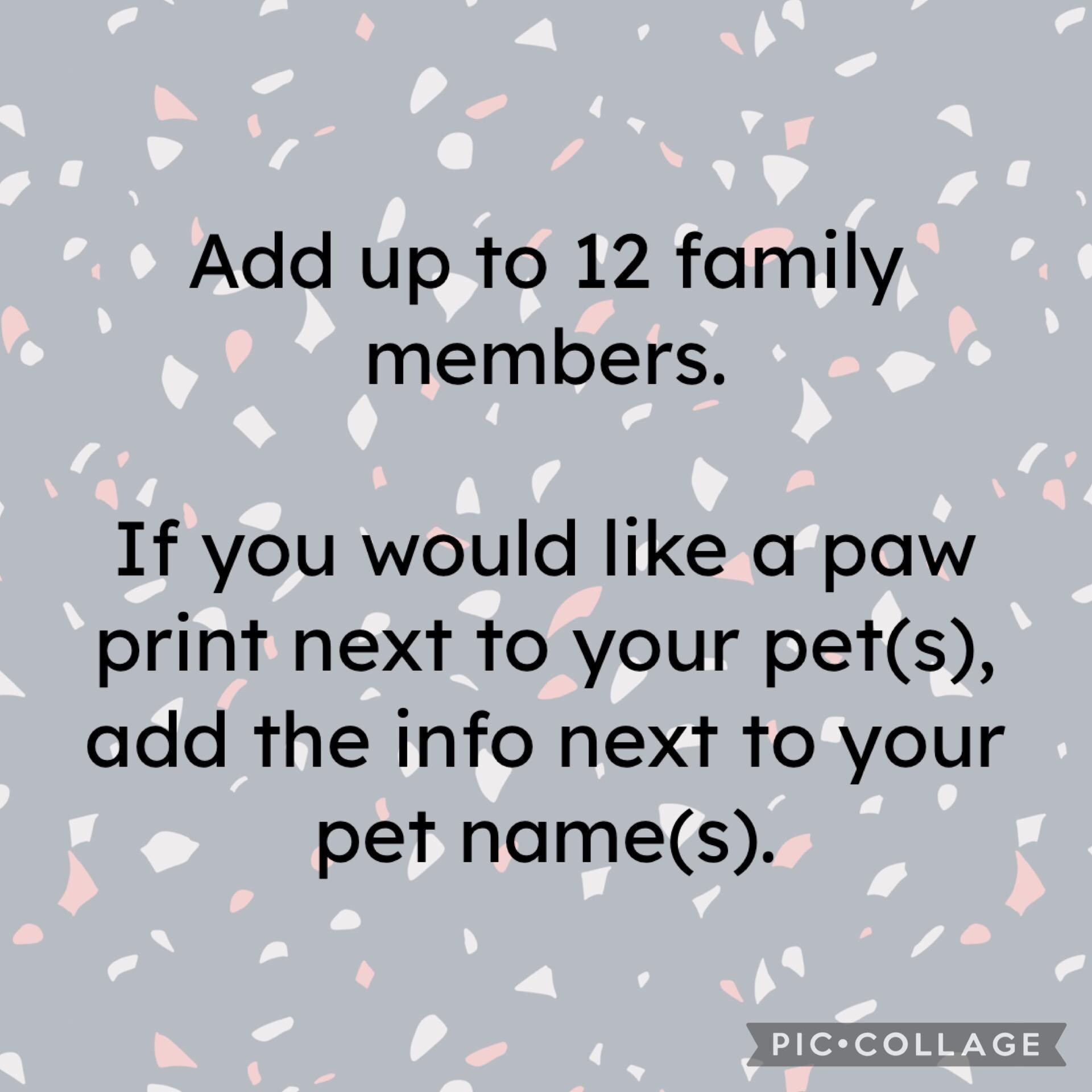 Create a keepsake that’s as unique as your family! This personalized family ornament is the perfect way to celebrate your loved ones during the holidays. Customize with up to 12 family members — including names, pets, or special titles — to make it truly your own.