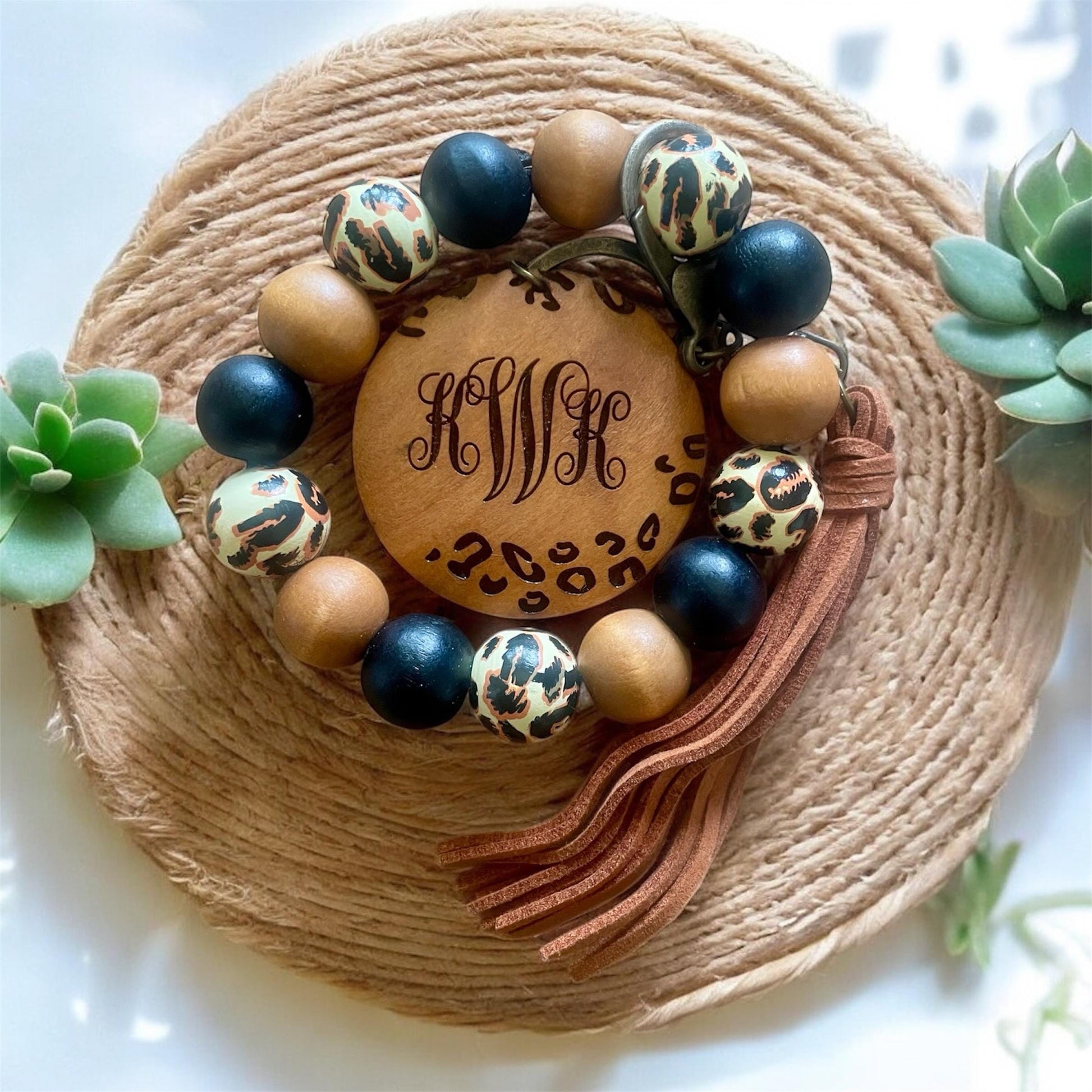 Personalized Wristlet Keychain, Engraved Keychain, Wood Bead Keychain, Bracelet Keychain, Gift for Her, Gift for Mom, Mama Keychain, Leopard